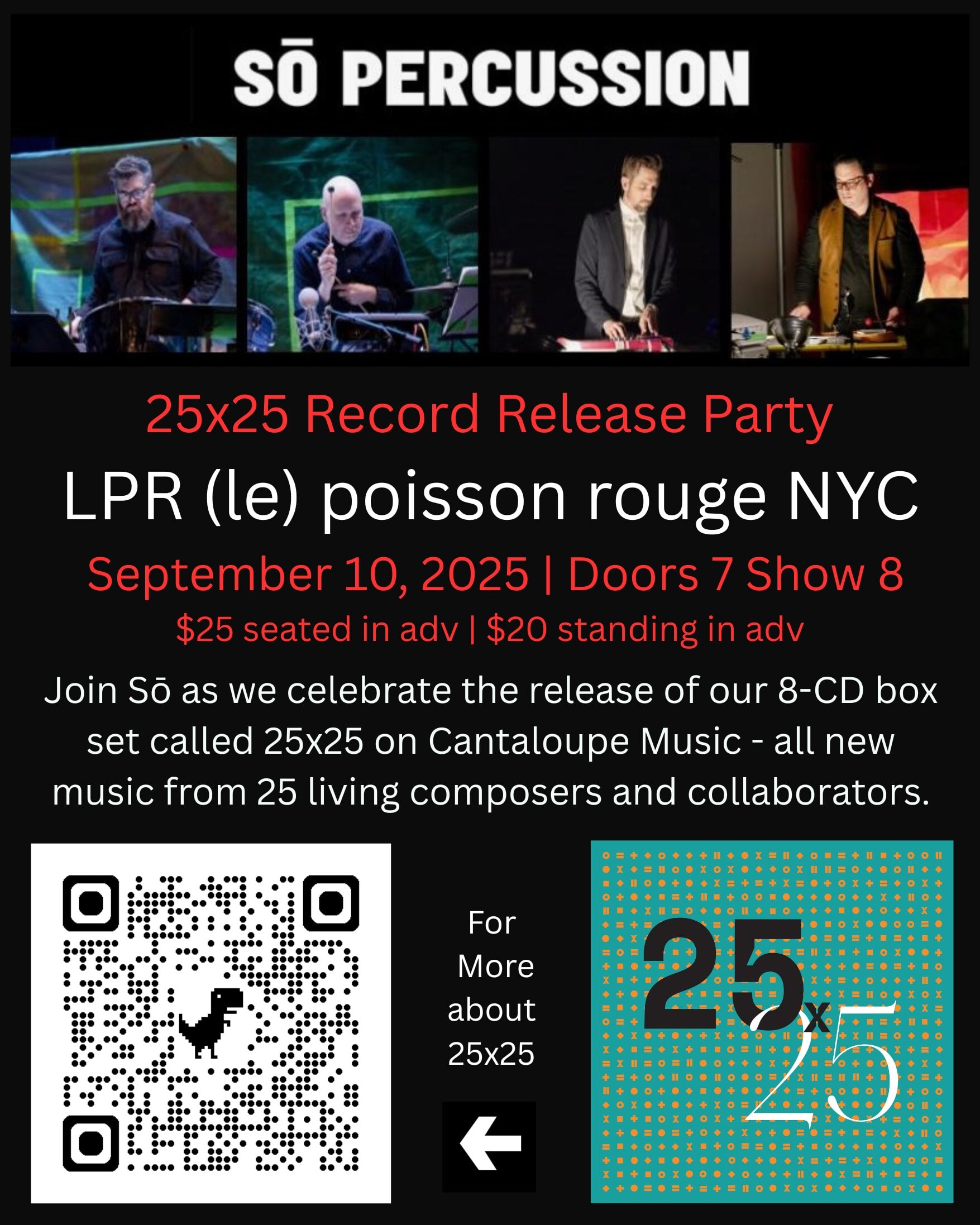 Since their founding 25 years ago, Sō Percussion – Jason Treuting, Adam Sliwinski, Josh Quillen, and Eric Cha-Beach – have been hailed for their gripping performances and wildly creative collaborations, winning a 2025 Grammy award for Rectangles and Circumstance, their most recent Nonesuch Records collaboration with Caroline Shaw. Sō now celebrates its 25th anniversary, not with a retrospective release but, more characteristically, with an 8-disc box set featuring entirely new and previously-unreleased recordings, coming out on Cantaloupe Music on Sept 26.