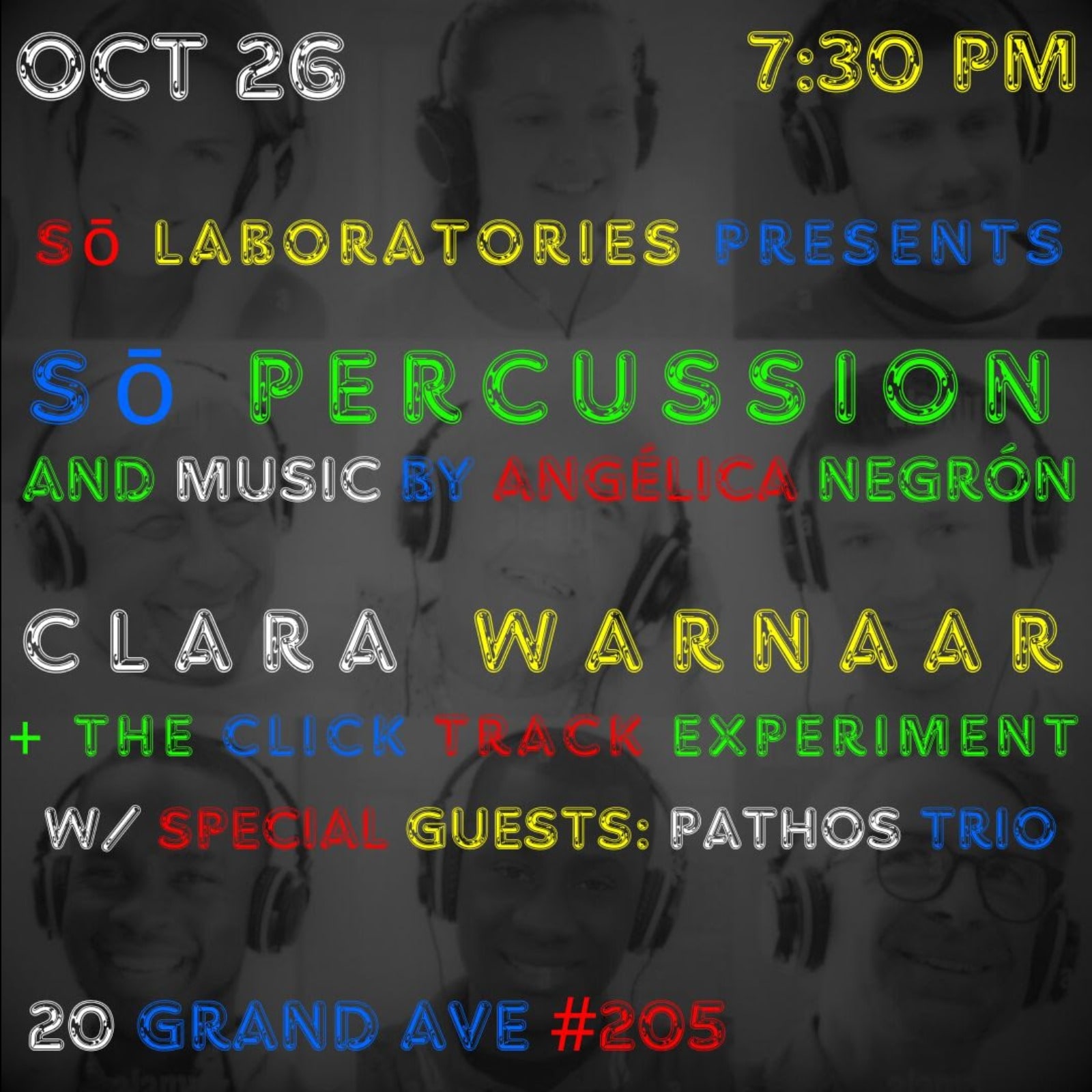 Our experimental and personal music series, Sō Laboratories (formerly known as Brooklyn Bound!) continues this month with a performance by the brilliant percussionist/drummer/composer Clara Warnaar offering a new project, The Click Track Experiment – alongside the excellent Pathos Trio.