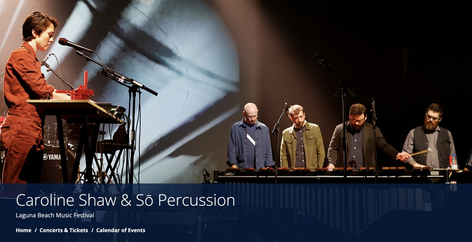 Sō Percussion and Caroline Shaw’s latest collaboration is Rectangles and Circumstance, the “hypnotically beautiful” (BBC Radio 3) new album from Nonesuch Records. The current tour of the album is augmented by songs from their previous collaborative work Let the Soil Play its Simple Part as well as an interlude from Caroline’s cinematic pop duo Ringdown, featuring co-songwriter and partner Danni Lee, plus recent compositions for Sō by members Jason Treuting and Eric Cha-Beach. The evening-length performance is a band-generated theatrical experience, featuring staging and design by director Mark DeChiazza. The musicians gradually place lights and reveal novel instruments as the show builds from a lone spotlight on Shaw singing “I’ll Fly Away” to the ecstatic full ensemble performing thrilling up-tempo songs like “Sing On” and “To the Sky,” as films by Sō Percussion member Jason Treuting splash across canvases throughout the stage. This production melds DIY design with dazzling original songs, to sensational effect.